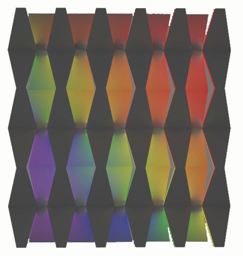 Color Wall is a window screening system that aims to filter light through reflecting it off of it's faceted surfaces which creates a diffused glow of color. The surface of the screen appears white in a neutral setting, however due to the colors painted on the back of the assembly, the system comes to life with the sun's rays. Different parts of the screen are highlighted throughout the day depending on their orientation to the sun. A full size prototype was created out of foam core and CNC milling to test the design.