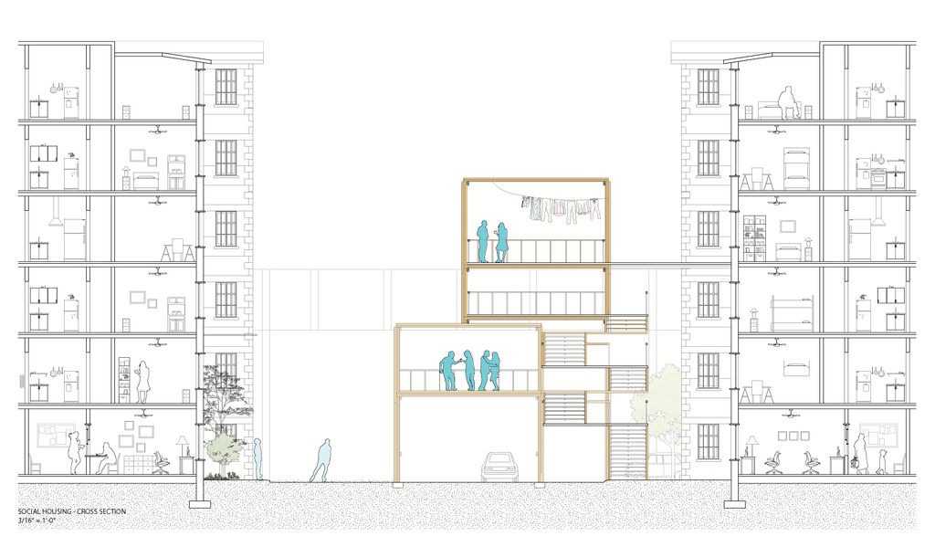 Responding to the different needs of the communities that build off of the mechanical structure, a multilevel circulation zone becomes populated with pockets of programmed spaces that interweave themselves into this architectural network.